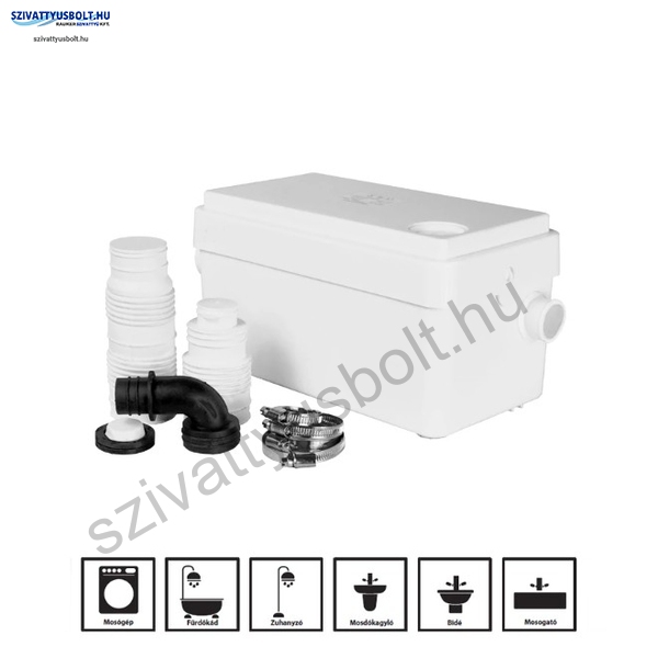 Kis méretű átemelőtelep az IBO-tól. IBO AQUASAN MINI szaniter szivattyú telep mosdóhoz, zuhanyzóhoz, mosógéphez alagsori helyiségekhez.