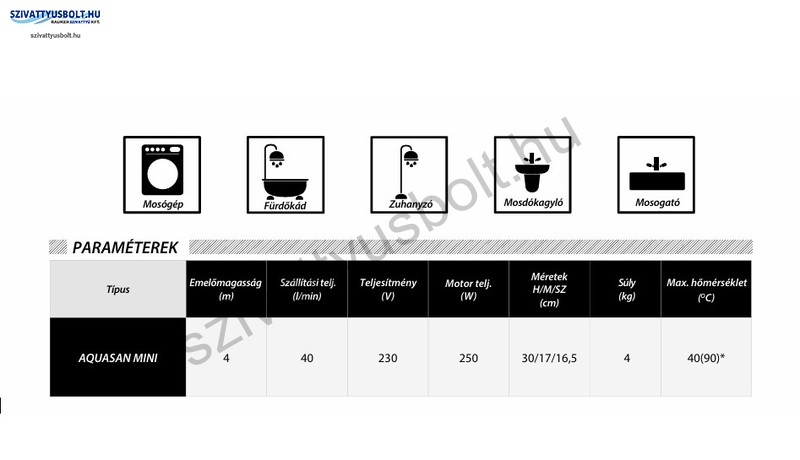 Az IBO AQUASAN MINI átemelő szivattyú telep elsősorban fürdőszobához, konyhához használatos berendezés. Különösen alagsorban, szuterén helyiségekben. A szivattyú hasonló felépítésű, mint a Sanibo mini szivattyúállomás, a kapcsolónak köszönhetően egy teljesen automatikus eszköz, amelyet a fürdőszobákban arra használnak, hogy a mosdóból, zuhanykabinból vagy a konyhába felszerelt mosógépekből vagy mosógatógépből történő víz elvezetését biztosítsa. Ideális fürdőszobákhoz, ahol a mosogató vagy zuhanytálca a szennyvízszivattyún kívül vagy az épületből származó szennyvízcsatorna alatt helyezkedik el. A szivattyú telep csatlakozhat többek között fürdőkád, zuhanyozófülke, mosógép, mosdókagyló, mosogató medence stb. A készülék kicsi mérete és a csendes működése lehetővé teszi a szivattyú diszkrét működését és így például a mosogató alatti szekrénybe is elhelyezhető.